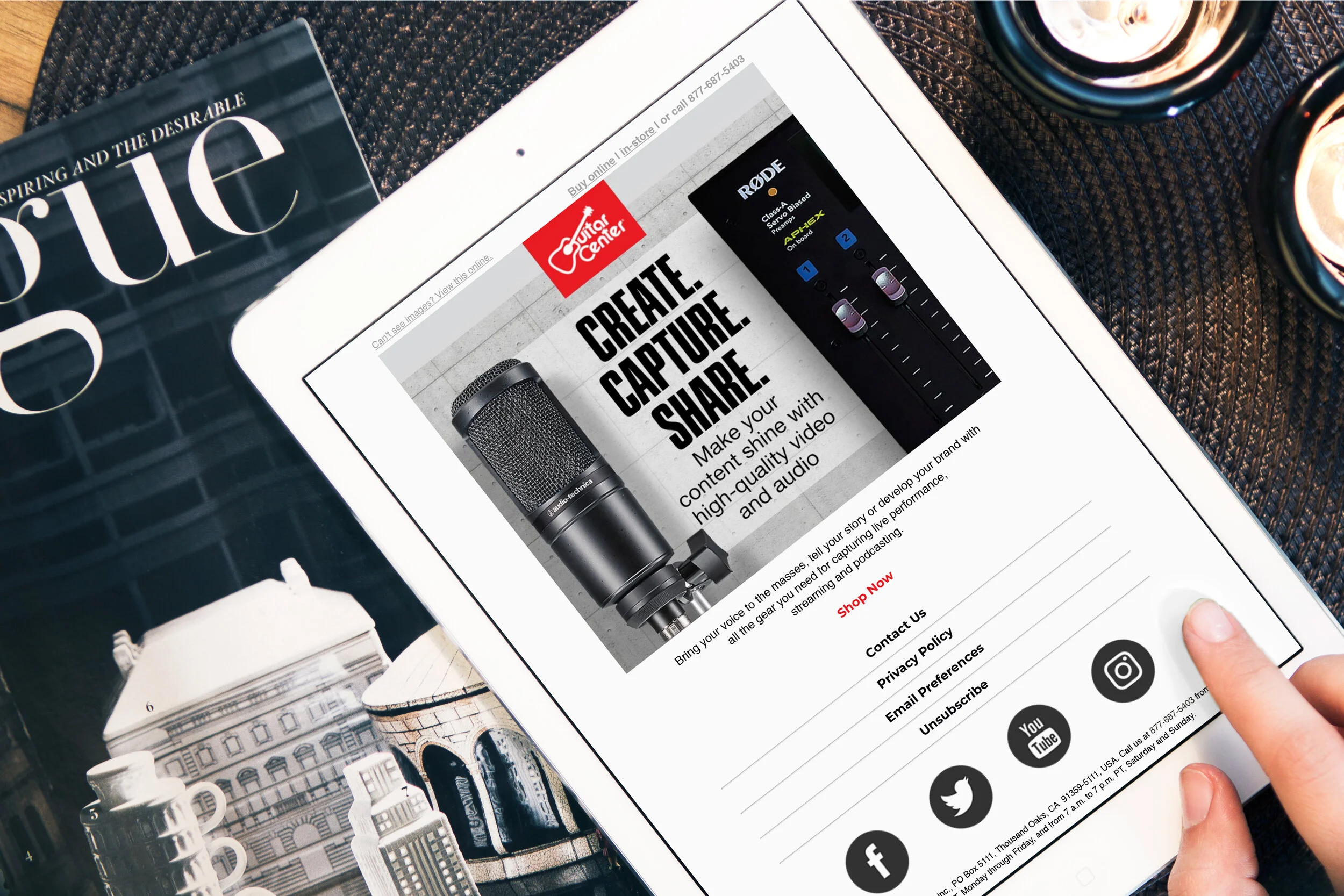 As the world of YouTube, Tik Tok, Twitch, and Instagram continues to grow, Guitar Center recognized an opportunity to capture a new target market of current and aspiring content creators who need to capture and create easily shareable audio and video content. This campaign was supported with email, a web landing page, and an in-store display and signage.
